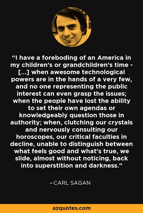 Carl Sagan Quote I Have A Foreboding. When nearly all the manufacturing industries have slipped away to other countries; When awesome technological powers are in the hands of a very few, and no one representing the public.