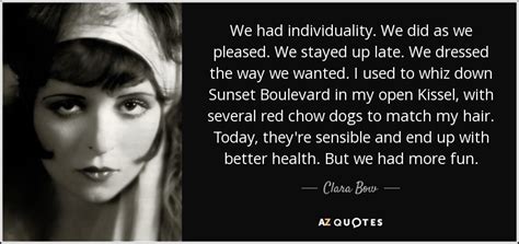 Clara Bow Quotes. ― clara bow, marilyn monroe: I used to whiz down sunset boulevard in my open kissel, with several red chow dogs to match my hair.