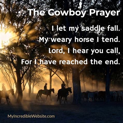 Put spurs on the foot of my coffin. Explore our collection of motivational and famous quotes by authors you know and love. I know that others find you in the light that's sifted down through tinted window panes, and yet i seem to feel you near tonight Nathanael west a true cowboy knows love, pain, and shame but never cares about fame. In this dim, quiet starlight on the plains. Does god answer prayers of some, and ignore the prayers of others? He awakened the sheepherder and they started for the shack. Roped by our father’s hand. Lord, i hear you call, for i have reached the end. Web the cowboy's prayer by clem mcspadden. His boots now touch the clouds.