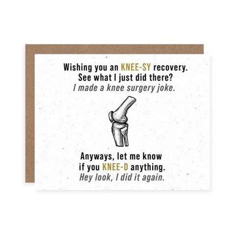 But, what if we told you that there’s a way to. Web if you're not sure what to say to someone before surgery (or after surgery), you really only need two things: That's the only joint that was. You're a fighter, and i know you'll come back stronger than ever. See more ideas about humor, knee surgery, bones funny. If you’re looking for a good laugh, then you’ve come to the right place! If you’ve never sent someone off to surgery before, you may not know what to say. Web check out our knee surgery funny selection for the very best in unique or custom, handmade pieces from our graphic tees shops. Web wishing you a swift and complete recovery after your knee surgery. Find funny gifs, cute gifs, reaction gifs and more.