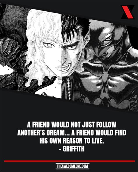 “is he living his dreams in death? A person with the potential to be my true friend, must be able to find his reason for life without my help. A person with the potential to be my true friend must be able to find his own reason for life without my help. And guts definitely left to find his own dream because of what griffith said. What are skills of a. You are right in saying that it is one of the facets we, men, possess. And he should put his heart and soul into protecting his dream. After meeting guts, griffith defeats him in battle and forces him to join the. Why do men like to shed blood, you asked. I will not lose this fight! well, why don't you show me?