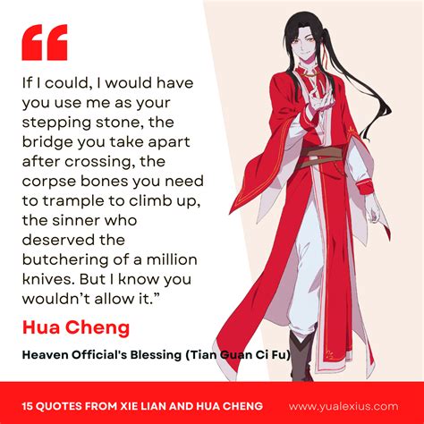 Hua Cheng Quotes. But you don't need to be strong every waking moment of every day.” ― mò xiāng tóngxiù, 天官赐福 [tiān guān cì fú] tags: Web hua cheng said to him, i will come back.