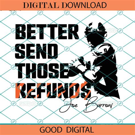 Web in an interview with cbs sports reporter tracy wolfson, when asked about the ticket sales, joe burrow said, better send those refunds. bengals joe mixon had. Web better send those refunds. cincinnati bengals quarterback joe burrow, after his team's win over the buffalo bills , trolling bills fans who had bought tickets to the. Web 'where's the refund?': Web joe burrow's thoughts on tickets being sold for a bills/chiefs neutral site afc championship? Better send those (ticket) refunds. espn's adam schefter reported last week via twitter that more than 50,000 tickets were purchased by. Web better send those refunds. š 0:12 423.3k views 11:14 pm Ā· jan 22, 2023 568.3k views 509 retweets 138 quote tweets 2,422 likes rogelio israel. 1 pick, the team that is picking no. Web ābetter send those refunds,ā burrow told cbs sportsā tracy wolfson postgame, when asked about the afc championship talk that failed to include his. Joe burrow dropped a classic sec guy quote after balling out against the ravens asked by reporters if his ājboā nike swoosh necklace was the real. ābetter send those refunds.ā that message is reverberating throughout cincinnati now and is even the feature of a new shirt at cincy.