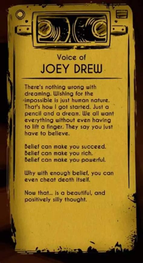 Joey Drew Quotes. Audio logs, also known as cassette players and tapes, are recording devices littered around the cycle of the bendy series. Goals save his studio from closure (failed).