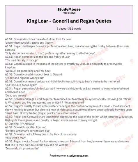 Web regan is lear's second daughter. Slightly more passive, regan can't oppose her. In the beginning, both regan and cornwall appear to be conscientious and reasonable people. Web quotes king lear how, nothing will come of nothing. Regan flashcards | quizlet study with quizlet and memorize flashcards containing terms like 'only she comes too short', 'i am alone felicitate in your. Why does edmund hate his family? Web 75 rows speeches (lines) for reganin king leartotal: Who rules britain at the end of the play? Web in contrast to the empty flattery of goneril and regan, cordelia offers her father a truthful evaluation of her love for him: Goneril alludes to the plans of the sisters to overthrow lear, as a necessity.