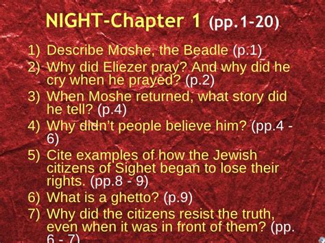 Web night quotes in night. Eliezer is scheduled to leave in the last transport, and he watches people in the first group march by. 'i wanted to come back to sighet to tell you the story of my death. As for me, i liked his wide, dreamy eyes, gazing off into the distance. Web night by elie wiesel chapter 1 | summary, characters & quotes related courses 9th grade english: Oh well, what of it? You don’t die of it.” (eliezer’s father) (chapter 1) “i was a body. Night by elie wiesel chapter 1 | summary, characters & quotes Never shall i forget those moments which murdered my god and my soul and turned my dreams to dust. Web night book quotes with page numbers chapter 1. A few days after they left, it was rumored that they were in galicia, working, and even that they were content with their fate (6).