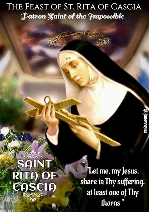 Showing search results for saint rita of cascia sorted by relevance. Rita had a great devotion for the passion of christ. Saint rita, given special grace from heaven, pray for us. — ursula burns the odd thing about war, it shows who you are, not who you think you are. Web pray for us, o holy st. I've had many mentors, but the one that has the most impact was my mother. “rita, who carried sunshine and holiness as an atmosphere, had to undergo so many trials and sufferings.” really touch the deepest parts of my heart as it opens my own germinated wounds through greater love for the passion of jesus christ and being able to humbly express positive thoughts and feelings. Otherwise you’re just an inert chunk of randomly assembled molecules drifting wherever the universe blows you.”. She is the patroness of impossible causes and hopeless circumstances because of her difficult and disappointing life. Help me this day to give myself to him as you did, without limit, without fear, without counting the cost. We must faithfully keep what we have promised.