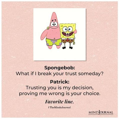 In 2011, a joyreactor user shared a meme that seemingly came from 9gag showing spongebob and patrick sitting on the floor. Hello@kidadl.com on 26 february 2021 ; “home is where you’re surrounded by other critters that care about you.”. Web what is the 'trusting you is my decision' quote? “you can’t always get what you want. “the inner machinations of my mind are an enigma.” 6. “if i were to die right now in a fiery explosion due to the carelessness of a friend, hen it would just be alright.”. Trusting you is my decision, proving me wrong is yours 79 share. Trusting love quote #6640789 all quotes · love · friendship · spongebob · patrick · spongebob: “hey patrick, i thought of something funnier than 24… 25!”.