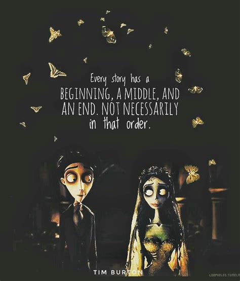 Tim Burton Quotes Corpse Bride. We've searched our database for all the quotes and captions related to corpse bride. Give me a listen, you corpses of cheer,/least those of you who still got an ear./i'll tell you a story make a skeleton cry/of our own jubiliciously lovely corpse bride!